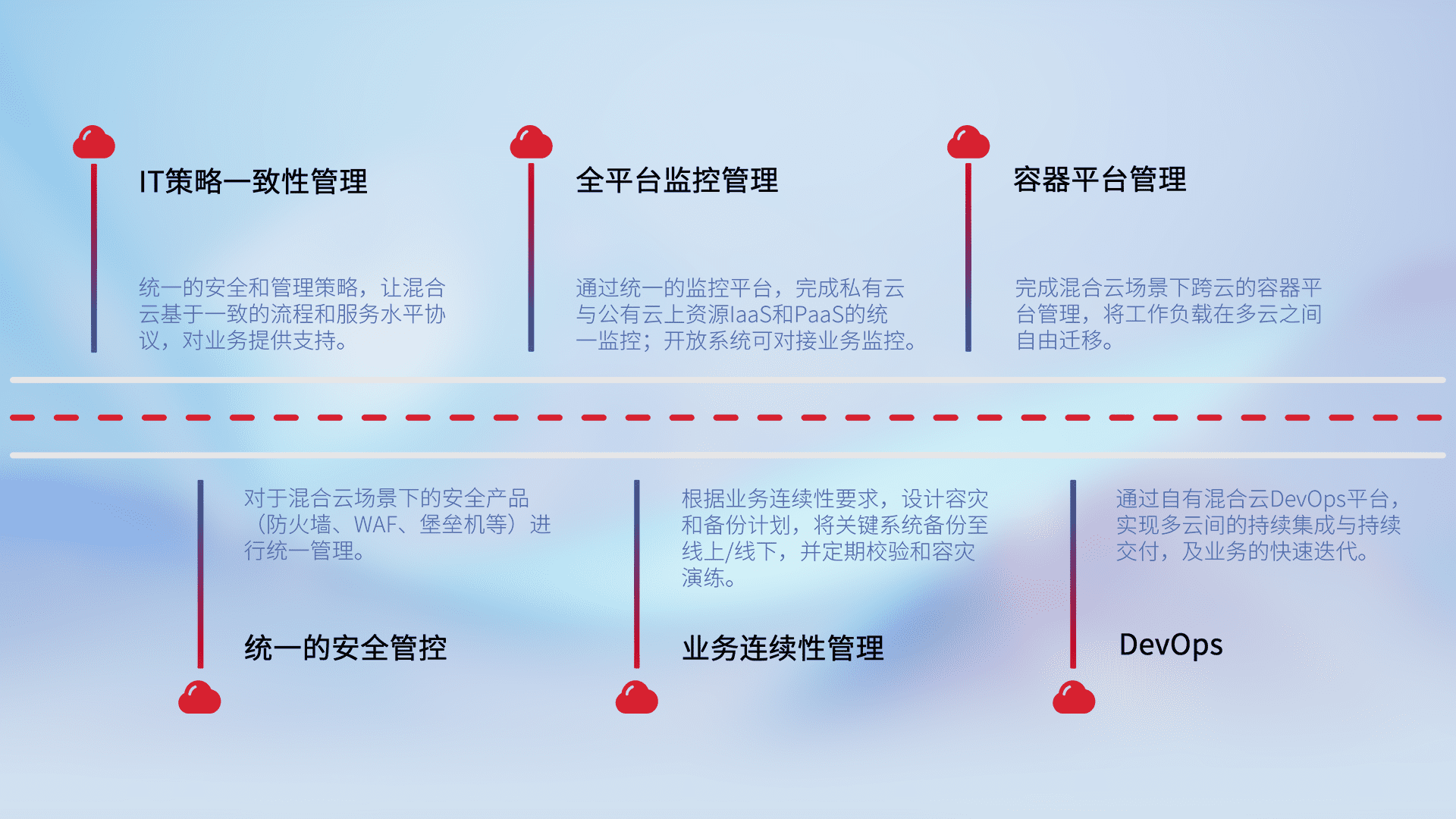 通过多云纳管,,以统一的资源数据模型把客户的云资源进行抽象和封装,,进而实现对多云资源的统一操作,,保障云资源管理的可靠性、、、稳定性与可用性。。。量身定制化运维内容,,配置、、、、开发运维、、补丁管理、、、备份、、、监控、、认证和访问管理、、审计和日常巡检等,,,保障在用云过程中的可靠度,,,稳定度以及高可用率。。。